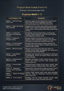 Pada kursus ini Anda akan mendapatkan 24 Jam Training Coaching berbasis ICF dengan materi sebagai berikut: